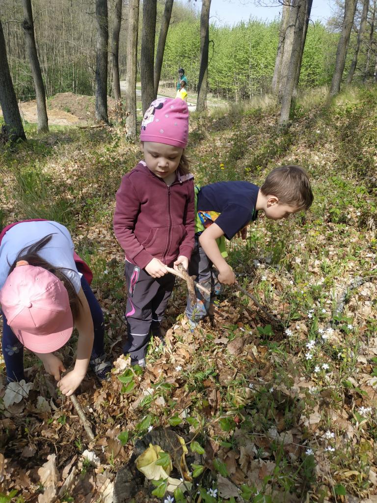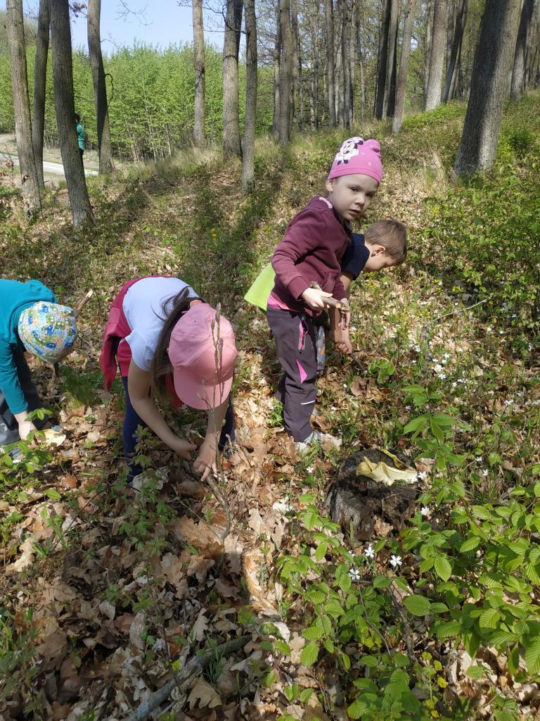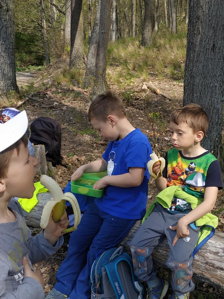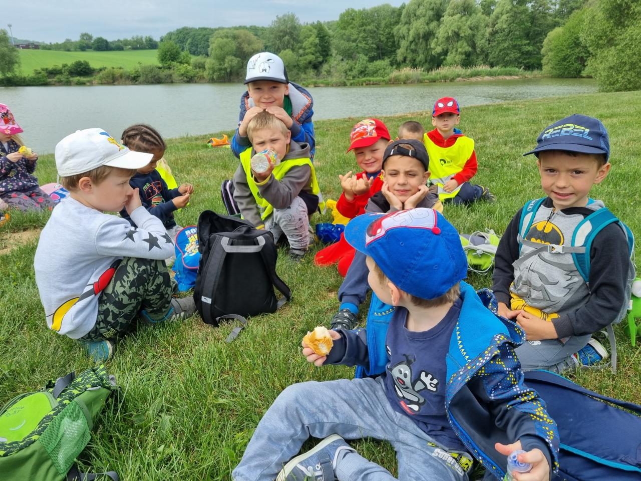 Vycházky do lesa - stavby domečků z přírodnin a k rybníku, nezbytné občerstvení po dlouhé cestě, .